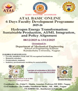 The Department of Mechanical Engineering, School of Engineering Sciences, Ramdeobaba University, Nagpur is organising a 6-Day Online ATAL Faculty Development Programme on “Hydrogen Energy Transformation: Sustainable Production, AI/ML Integration, and Policy Alignment”, scheduled from 08 December 2025 to 13 December 2025. This FDP is designed to provide participants with insights into green hydrogen production, energy storage, AI/ML applications, safety, sustainability and, The programme will feature experts from IITs, NEERI, TERI, DIAT, BITS Pilani, and leading government and research institutions, offering knowledge through interactive sessions and expert-led discussions. The FDP is open to faculty members, research scholars, postgraduate students, industry professionals, and policymakers working or aspiring to work in sustainable energy domains. There is no registration fee, and participation certificates will be awarded upon fulfilling ATAL requirements.