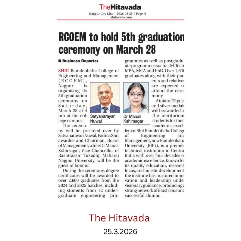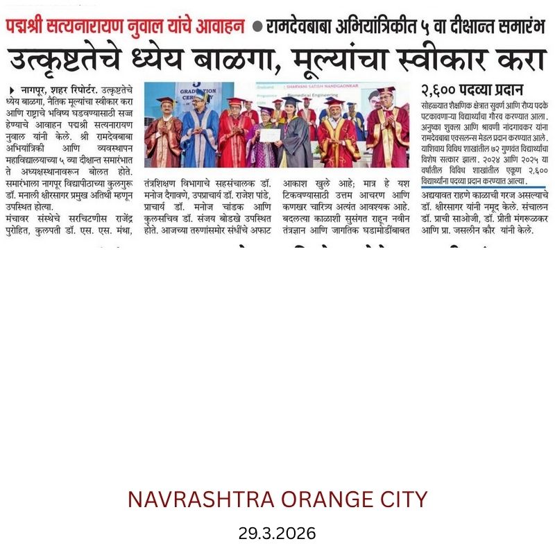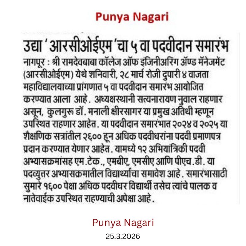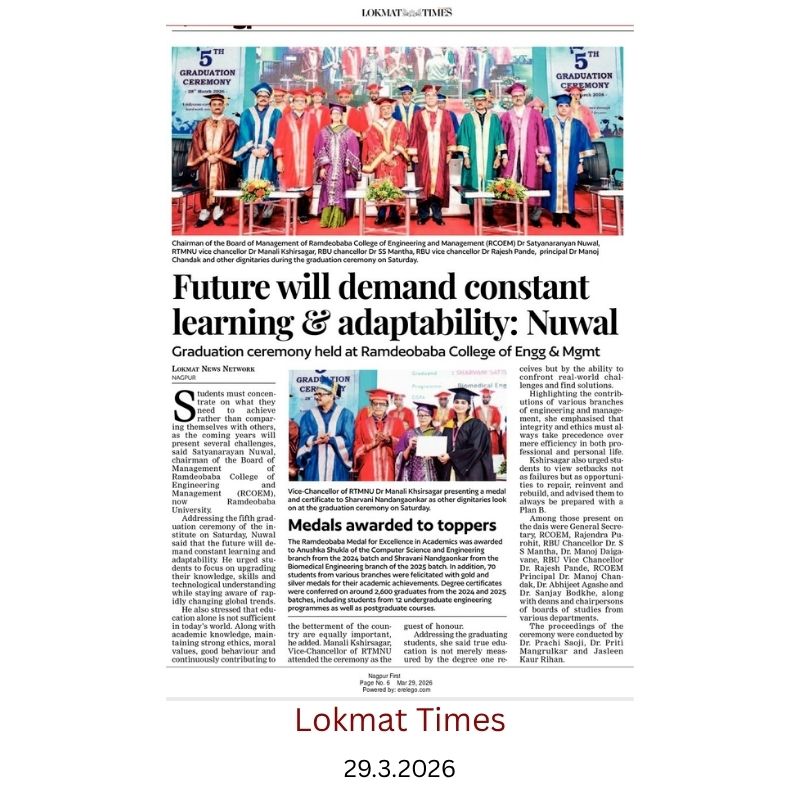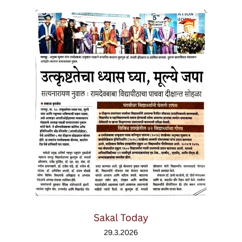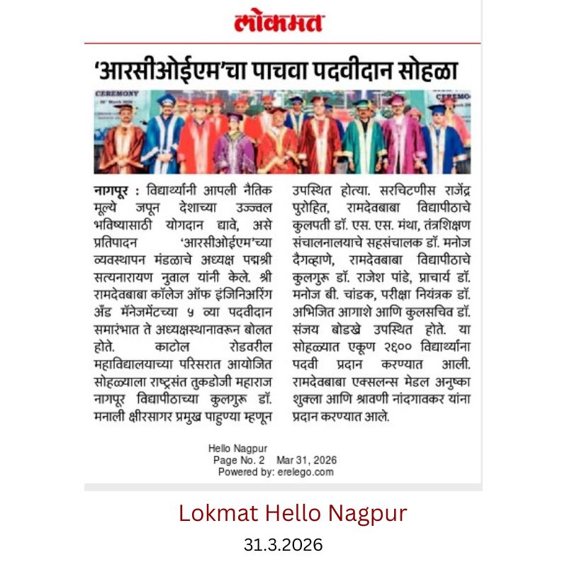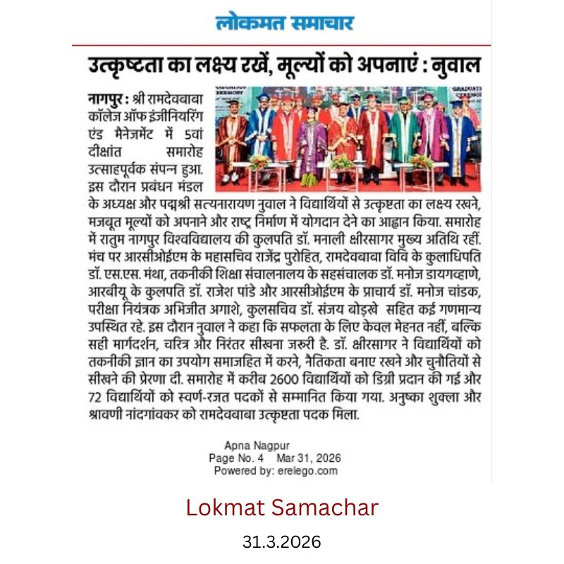 2026 2025 January Ramdeobaba University7.1.2026 प्रतिकूल परिस्थितीतच नवकल्पनांचा उदय : माहिती आयुक्त राहुल पांडे20.1.2026 उद्घोष ८.०' वार्षिक क्रिडा महोत्सव31.1.2026 The Best of Literature and innovation emerge during times of challenge: SCIC Rahul Pande17.1.2026 प्रतिकूल परिस्थितीतच नाविण्यपूर्ण कल्पनांचा उदय : आरबीयू लिट फेस्ट उद्घाटन20.1.2026 रामदेवबाबा विद्यापीठात वंदे मातरम गौरव सोहळा31.1.2026 प्रतिकूल परिस्थितीयों में ही श्रेष्ठ साहित्य का उदय: आरबीयू लिटफेस्ट २०२६19.1.2026 Republic Day at Ramdeobaba University27.1.2026 Ramdeobaba University's Lit Fest '26 Treasure Trove. 19.1.2026 रामदेवबाबा विद्यापीठात तिरंग्याला सलामी 29.1.2026 February आरबीयू'मधील विद्यार्थ्यांना जपानमध्ये शैक्षणिक अनुभव15.2.2026 RBU and Hiroshima University Conduct Transdisciplinary Immersion Programme12.2.2026 RBU Collaborates with Google Cloud20.2.2026 Ramdeobaba University Honors Shri Nuwal Ji26.2.2026 Ramdeobaba University Honours Satyanarayan Nuwal26.2.2026 R C Plasto Contributes Rs. 38.23 Lakh for e-Library at RBU28.2.2026 रामदेवबाबा विवि में 'उद्घोष 8.0'9.2.2026 आरबीयू छात्रों को मिलेंगे २ वैश्विक प्रमाणपत्र19.2.2026 आरबीयू को मिली 'सर्टिफाइड डिजिटल कैंपस' की मान्यता20.2.2026 पद्मश्री सत्यनारायण नुवाल जी का आरबीयू में सत्कार26.2.2026 रामदेवबाबा विद्यापीठातर्फे नुवाल यांचा सत्कार26.2.2026 प्लास्टोने रामदेवबाबा विद्यापीठाला केली मदत28.2.2026 रामदेवबाबा विद्यापीठात "उद्घोष ८.०" चा समारोप9.2.2026 रामदेवबाबा आता एआय फर्स्ट कॅम्पस19.2.2026 RBU Becomes "Certified Digital Campus" on Google Cloud 3.021.2.2026 मेरा सम्मान गुरुओं, गाइड, राष्ट्र को समर्पित: सत्यनारायण नुवाल26.2.2026 नुवाल यांचा रामदेवबाबा विद्यापीठात सत्कार26.2.2026 प्लास्टो का रामदेवबाबा विवि को सहयोग 28.2.2026 रामदेवबाबा मध्ये "उद्घोष ८.०" उत्साहात 9.2.2026 रामदेवबाबा विश्वविद्यालय की गूगल क्लाउड के साथ भागीदारी 19.2.2026 गूगल क्लाऊडसोबत आरबीयूची भागीदारी 26.2.2026 यह सम्मान राष्ट्र की सेवा को समर्पित26.2.2026 हा सन्मान माझ्या गुरूंचा, सहकाऱ्यांचा आणि देशवासीयांचा.26.2.2026 आर. सी प्लास्टोची रामदेवबाबा विद्यापीठाला ३८ लाखांची मदत.28.2.2026 March RCOEM Students Secured 1st Position at National Level Hackathon03.3.2026 रामदेवबाबा विद्यापीठात 'अन्वेषण २६' तांत्रिक महोत्सव11.3.2026 आयआयटी आणि रामदेवबाबा विद्यापीठात झाला सामंजस्य करार27.3.2026 आरसीओईएम’चा पाचवा पदवीदान सोहळा31.3.2026 Future will demand constant learning & adaptability: Nuwal29.3.2026 जीवनातील ‘बज’ प्रयत्नांनी दूर करा : डॉ. क्षीरसागरl29.3.2026 आर. सी. प्लास्टोतर्फे आरबीयूला संगणक प्रयोगशाळेसाठी ३८ लाखांची मदत05.3.2026 आर. सी प्लास्टो कडून रामदेवबाबा विद्यापीठाला ३८.२३ लाखांचे योगदान01.3.2026 RCOEM to Hold 5th Graduation Ceremony on March 2825.3.2026 उपलब्धि : 72 स्वर्ण एवं रजत पदक से छात्र सम्मानित29.3.2026 उत्कृष्टता का लक्ष्य रखें : नुवाल29.3.2026 उत्कृष्टतेचा ध्यास घ्या, मूल्य जपा 29.3.2026 'Anveshan 26' at RBU By Electrical Engineering Department09.3.2026 आरबीयू, आरएसएस आणि लोककल्याण समितीकडून नेत्र तपासणी शिबिर12.3.2026 उद्या 'आरसीओईएम'चा ५ वा पदवीदान समारंभ25.3.2026 Strive, evolve, lead: Satyanarayan Nuwal29.3.2026 उत्कृष्टतेचे ध्येय बाळगा, मूल्यांचा स्वीकार करा29.3.2026 आरबीयू में रक्षा त