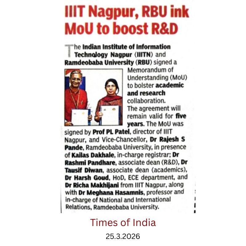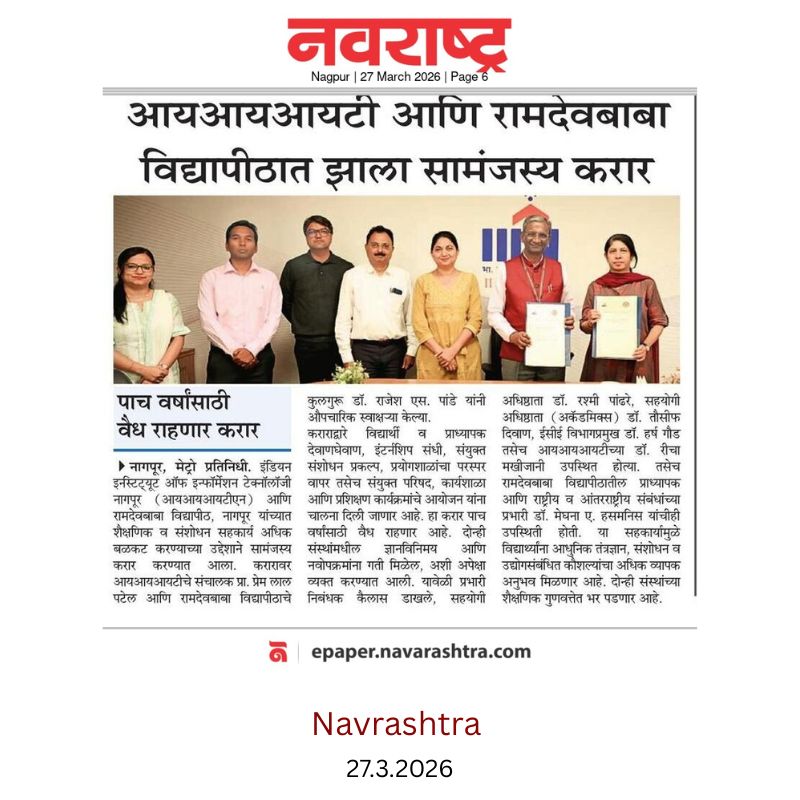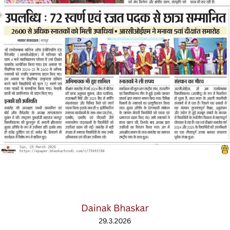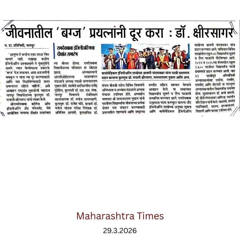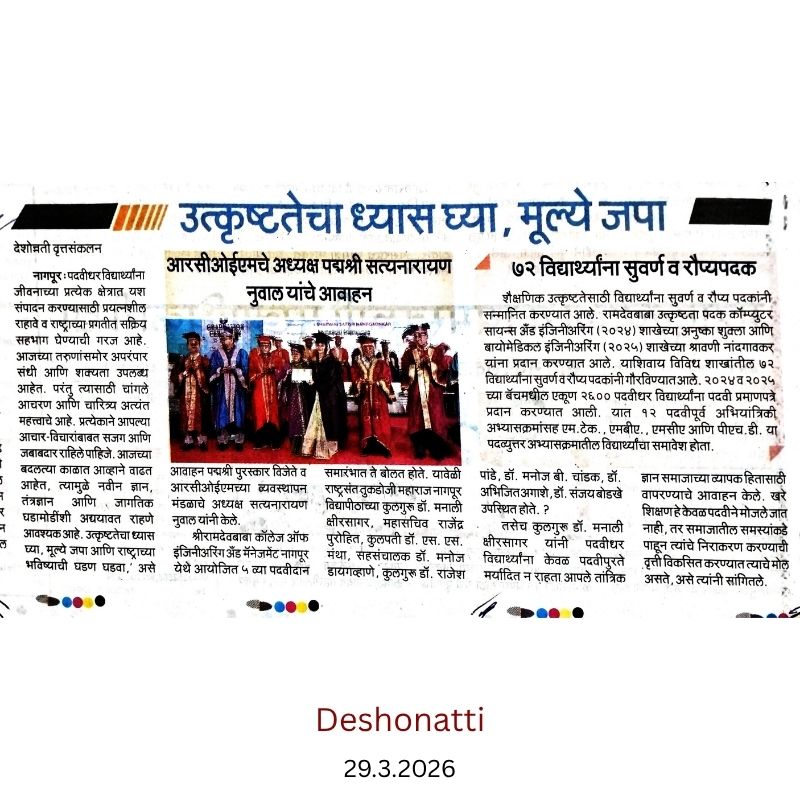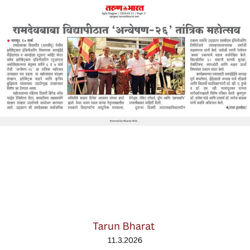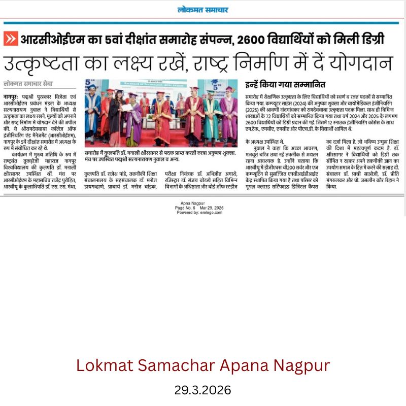 2026 2025 January Ramdeobaba University7.1.2026 प्रतिकूल परिस्थितीतच नवकल्पनांचा उदय : माहिती आयुक्त राहुल पांडे20.1.2026 उद्घोष ८.०' वार्षिक क्रिडा महोत्सव31.1.2026 The Best of Literature and innovation emerge during times of challenge: SCIC Rahul Pande17.1.2026 प्रतिकूल परिस्थितीतच नाविण्यपूर्ण कल्पनांचा उदय : आरबीयू लिट फेस्ट उद्घाटन20.1.2026 रामदेवबाबा विद्यापीठात वंदे मातरम गौरव सोहळा31.1.2026 प्रतिकूल परिस्थितीयों में ही श्रेष्ठ साहित्य का उदय: आरबीयू लिटफेस्ट २०२६19.1.2026 Republic Day at Ramdeobaba University27.1.2026 Ramdeobaba University's Lit Fest '26 Treasure Trove. 19.1.2026 रामदेवबाबा विद्यापीठात तिरंग्याला सलामी 29.1.2026 February आरबीयू'मधील विद्यार्थ्यांना जपानमध्ये शैक्षणिक अनुभव15.2.2026 RBU and Hiroshima University Conduct Transdisciplinary Immersion Programme12.2.2026 RBU Collaborates with Google Cloud20.2.2026 Ramdeobaba University Honors Shri Nuwal Ji26.2.2026 Ramdeobaba University Honours Satyanarayan Nuwal26.2.2026 R C Plasto Contributes Rs. 38.23 Lakh for e-Library at RBU28.2.2026 रामदेवबाबा विवि में 'उद्घोष 8.0'9.2.2026 आरबीयू छात्रों को मिलेंगे २ वैश्विक प्रमाणपत्र19.2.2026 आरबीयू को मिली 'सर्टिफाइड डिजिटल कैंपस' की मान्यता20.2.2026 पद्मश्री सत्यनारायण नुवाल जी का आरबीयू में सत्कार26.2.2026 रामदेवबाबा विद्यापीठातर्फे नुवाल यांचा सत्कार26.2.2026 प्लास्टोने रामदेवबाबा विद्यापीठाला केली मदत28.2.2026 रामदेवबाबा विद्यापीठात "उद्घोष ८.०" चा समारोप9.2.2026 रामदेवबाबा आता एआय फर्स्ट कॅम्पस19.2.2026 RBU Becomes "Certified Digital Campus" on Google Cloud 3.021.2.2026 मेरा सम्मान गुरुओं, गाइड, राष्ट्र को समर्पित: सत्यनारायण नुवाल26.2.2026 नुवाल यांचा रामदेवबाबा विद्यापीठात सत्कार26.2.2026 प्लास्टो का रामदेवबाबा विवि को सहयोग 28.2.2026 रामदेवबाबा मध्ये "उद्घोष ८.०" उत्साहात 9.2.2026 रामदेवबाबा विश्वविद्यालय की गूगल क्लाउड के साथ भागीदारी 19.2.2026 गूगल क्लाऊडसोबत आरबीयूची भागीदारी 26.2.2026 यह सम्मान राष्ट्र की सेवा को समर्पित26.2.2026 हा सन्मान माझ्या गुरूंचा, सहकाऱ्यांचा आणि देशवासीयांचा.26.2.2026 आर. सी प्लास्टोची रामदेवबाबा विद्यापीठाला ३८ लाखांची मदत.28.2.2026 March RCOEM Students Secured 1st Position at National Level Hackathon03.3.2026 रामदेवबाबा विद्यापीठात 'अन्वेषण २६' तांत्रिक महोत्सव11.3.2026 आयआयटी आणि रामदेवबाबा विद्यापीठात झाला सामंजस्य करार27.3.2026 आरसीओईएम’चा पाचवा पदवीदान सोहळा31.3.2026 Future will demand constant learning & adaptability: Nuwal29.3.2026 जीवनातील ‘बज’ प्रयत्नांनी दूर करा : डॉ. क्षीरसागरl29.3.2026 आर. सी. प्लास्टोतर्फे आरबीयूला संगणक प्रयोगशाळेसाठी ३८ लाखांची मदत05.3.2026 आर. सी प्लास्टो कडून रामदेवबाबा विद्यापीठाला ३८.२३ लाखांचे योगदान01.3.2026 RCOEM to Hold 5th Graduation Ceremony on March 2825.3.2026 उपलब्धि : 72 स्वर्ण एवं रजत पदक से छात्र सम्मानित29.3.2026 उत्कृष्टता का लक्ष्य रखें : नुवाल29.3.2026 उत्कृष्टतेचा ध्यास घ्या, मूल्य जपा 29.3.2026 'Anveshan 26' at RBU By Electrical Engineering Department09.3.2026 आरबीयू, आरएसएस आणि लोककल्याण समितीकडून नेत्र तपासणी शिबिर12.3.2026 उद्या 'आरसीओईएम'चा ५ वा पदवीदान समारंभ25.3.2026 Strive, evolve, lead: Satyanarayan Nuwal29.3.2026 उत्कृष्टतेचे ध्येय बाळगा, मूल्यांचा स्वीकार करा29.3.2026 आरबीयू में रक्षा त