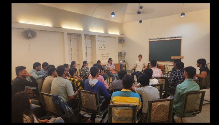 The meeting provided an opportunity for students to interact with German nationals working as interns with India Peace Centre. Mr. Helge, one of the interns, interacted with the students. The discussion included aspects of German culture, lifestyle, and higher education, along with comparisons between India and Germany. Our students tried to speak in German language with Mr. Helge.