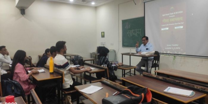 The session commenced with Pranav Soni(Spiritual Club Coordinator)&SanketGahukar(Former Spiritual Club Coordinator), warmly felicitating Shri Gopavrinda Pala Dasa ji after which Mohit Katre, Spiritual Club member, introduced them. Shri Gopavrinda Pala Dasa ji is renowned for his distinguished personality with background in Mechanical Engineering and his successful Entrepreneurial skills. His journey from the corporate world to dedicating his life in service to humanity is truly inspiring. He currently serves as the Vice President of the Akshaya Patra Foundation, Bhilai Chapter.